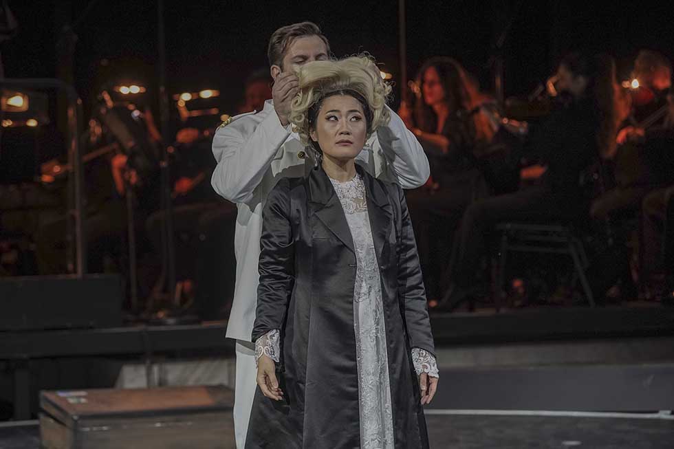 Τον ρόλο του τίτλου ερμηνεύει η ανερχόμενη Νοτιοκορεάτισσα υψίφωνος Άννα Σον. H Σον ολοκλήρωσε τις σπουδές της στο Μιλάνο και στη συνέχεια έκανε μαθήματα με τη Μιρέλλα Φρένι, τη Ρενάτα Σκόττο και τον Όλαφ Μπαιρ. Μετά τη συνεργασία της με την Εθνική Όπερα της Κορέας στη Σεούλ, εμφανίστηκε σε ιταλικά λυρικά θέατρα, καθώς και σε Ρώμη, Παρίσι, Αβινιόν, Λουξεμβούργο, Ζυρίχη κ.α. Τα τελευταία χρόνια είναι μέλος του ensemble της Όπερας του Ντόρτμουντ, όπου έχει ερμηνεύσει, μεταξύ άλλων, Μαντάμα Μπαττερφλάι και Λιου (Τουραντότ).