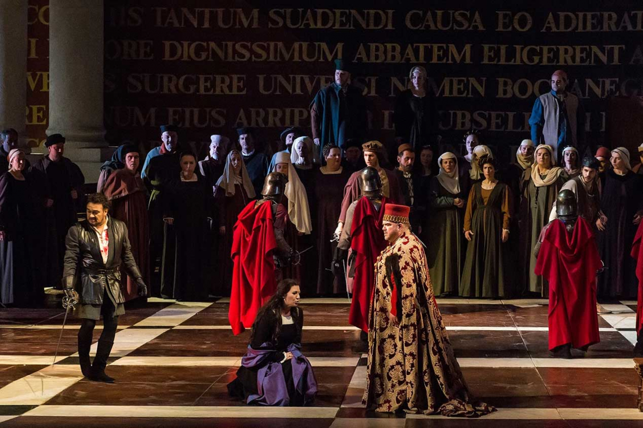 Ωστόσο, η Μαρία, στερημένη από τον αγαπημένο και από το παιδί της, έχει μόλις πεθάνει. Ο Φιέσκο ορκίζεται να εκδικηθεί τον άνθρωπο που ατίμασε την οικογένειά του και του στέρησε το παιδί του. Ο Μποκκανέγκρα τον συναντά έξω από το ανάκτορό του και ζητά συγχώρεση και συμφιλίωση. Ο Φιέσκο τον διώχνει και εξηγεί ότι αρνείται να τον ακούσει ώσπου να του παραδώσει την εγγονή του. Όμως, ο Μποκκανέγκρα δεν μπορεί να το κάνει αυτό, επειδή την τελευταία φορά που το επισκέφτηκε ανακάλυψε ότι η τροφός είχε πεθάνει και το κοριτσάκι δεν ήταν εκεί. Οι δύο άντρες χωρίζουν εχθρικά. Τη στιγμή που ο Μποκκανέγκρα ανακαλύπτει το άψυχο σώμα της Μαρίας, ακούει φωνές χαράς. Εξελέγη δόγης, ωστόσο η γυναίκα την οποία ήλπιζε να κερδίσει χάρη στο αξίωμά του δεν ήταν πλέον στη ζωή.