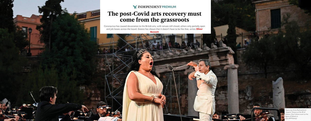 Στο ρεπορτάζ του έγκυρου βρετανικού Independent με τίτλο «Η ανάρρωση των τεχνών μετά τον κορονοϊό θα πρέπει να γίνει εκ βάθρων», ο δημοσιογράφος Oliver Bennett κάνει εκτενή αναφορά στα προβλήματα που προκάλεσε η πανδημία στον χώρο της τέχνης στη Βρετανία, στους τρόπους στήριξης των τεχνών από τις ευρωπαϊκές κυβερνήσεις και μιλάει, μεταξύ άλλων, με τον Καλλιτεχνικό Διευθυντή της Εθνικής Λυρικής Σκηνής Γιώργο Κουμεντάκη. Στον πρόλογο του ρεπορτάζ η εφημερίδα σημειώνει: «Ο κορονοϊός υπήρξε καταστροφικός για τις τέχνες στη Βρετανία, με τους πολιτιστικούς χώρους να παραμένουν κλειστοί, άλλους να ανοίγουν σταδιακά και με ανεργία σε όλους τους τομείς. Η Ελλάδα δείχνει ότι μπορεί να γίνει και αλλιώς».